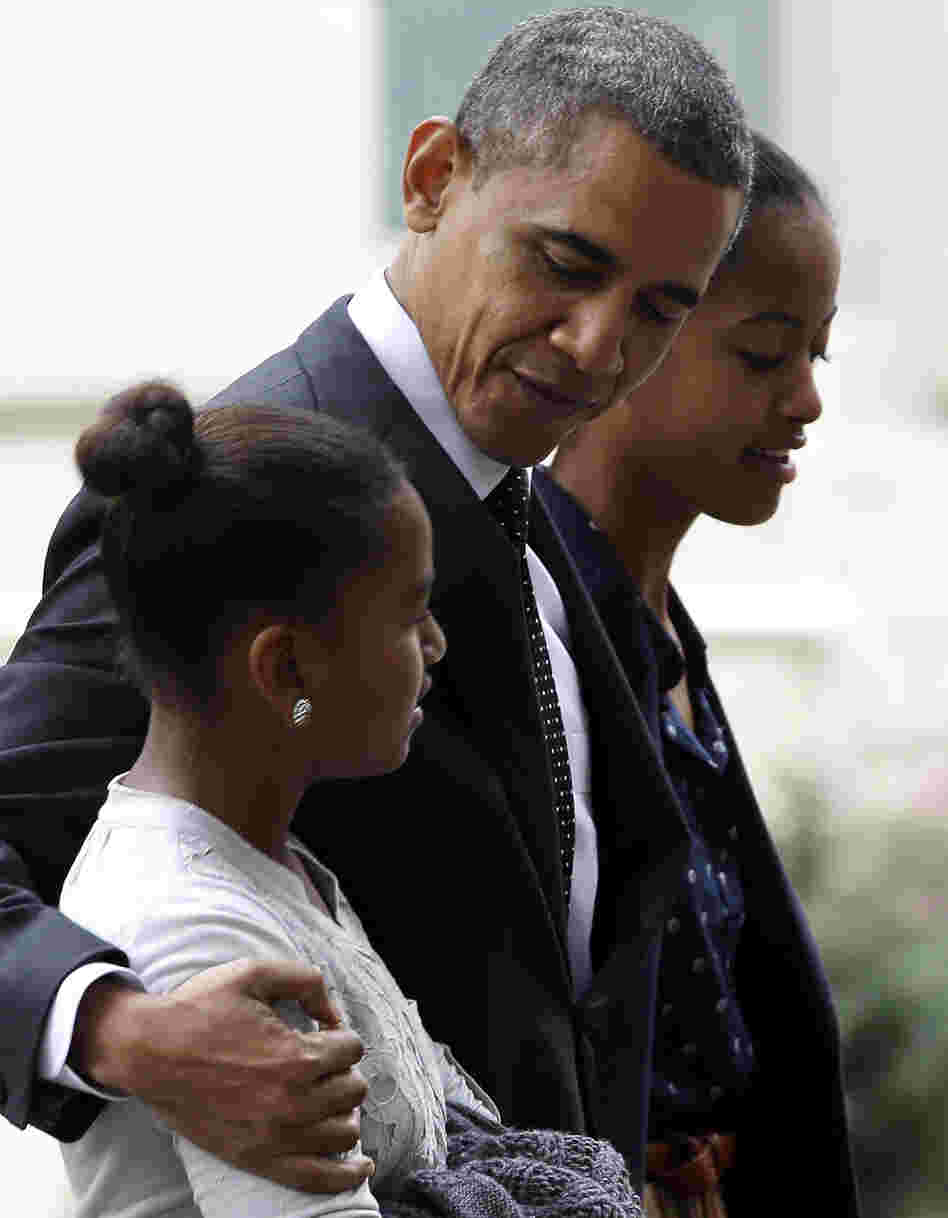 President Obama walks with his daughters Sasha, foreground, and Malia as they leave St. John's Episcopal Church in Washington, on Oct. 28. An analysis of exit polls shows that those who claim no specific religious affiliation were a key Obama voting bloc in the presidential race.