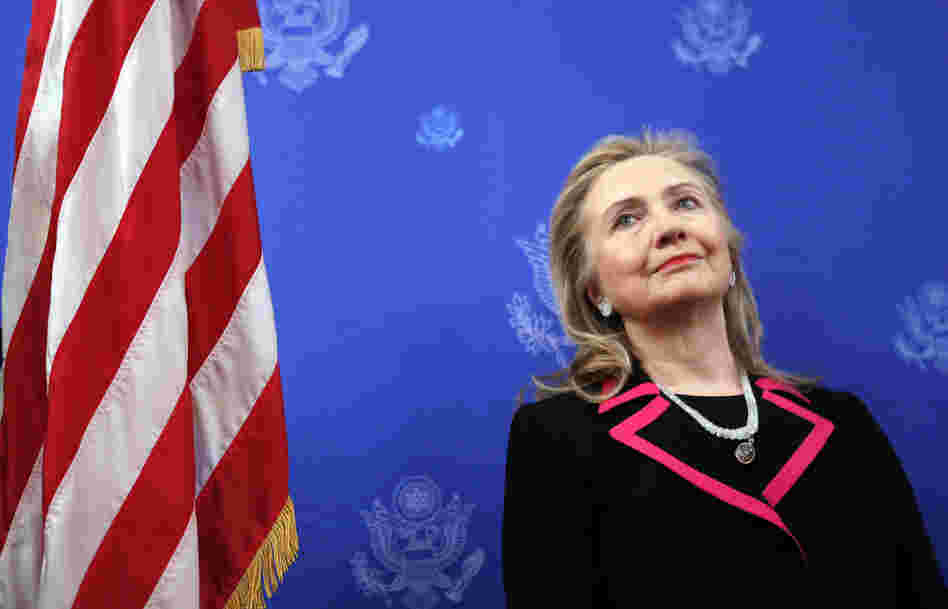 Secretary of State Hillary Clinton, as she is introduced to speak at the residence of the U.S. ambassador to Belgium in Brussels.