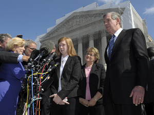 Abigail Fisher, the Texan involved in the University of Texas affirmative action case, accompanied by her attorney Bert Rein, right, talks to reporters outside the Supreme Court in October.