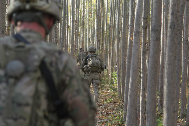 The platoon pushes on across a small stream and through the soft dirt of barren fields. Alulus ponders whether having Afghan forces on patrol with them would increase or decrease the level of threat they face.