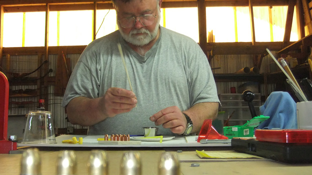 At the company's headquarters, Tony Landonwich sits at a loading table. Wearing protective eyewear, he loads a set of the special rounds.
