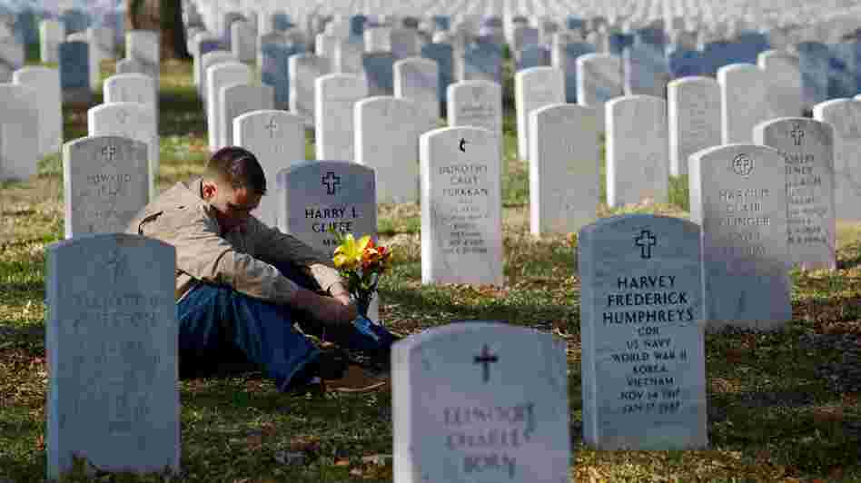 Marine Corps Capt. Jeff Cliffe, sat to reflect Sunday next to the grave of his grandfather and grandmother at Arlington National Cemetery in Virginia.