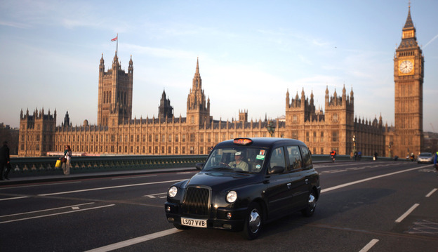 A cab makes its way over Westminster Bridge in London in March. The company that makes the traditional taxis has had financial difficulties, leaving cabbies in a lurch.