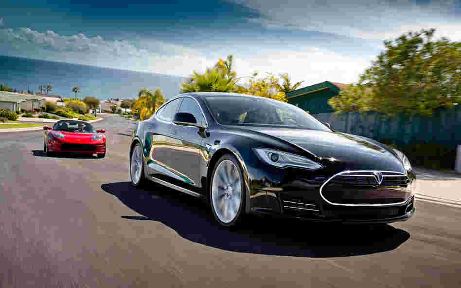 Model S Alpha, in black, and the Telsa Roadster behind it.