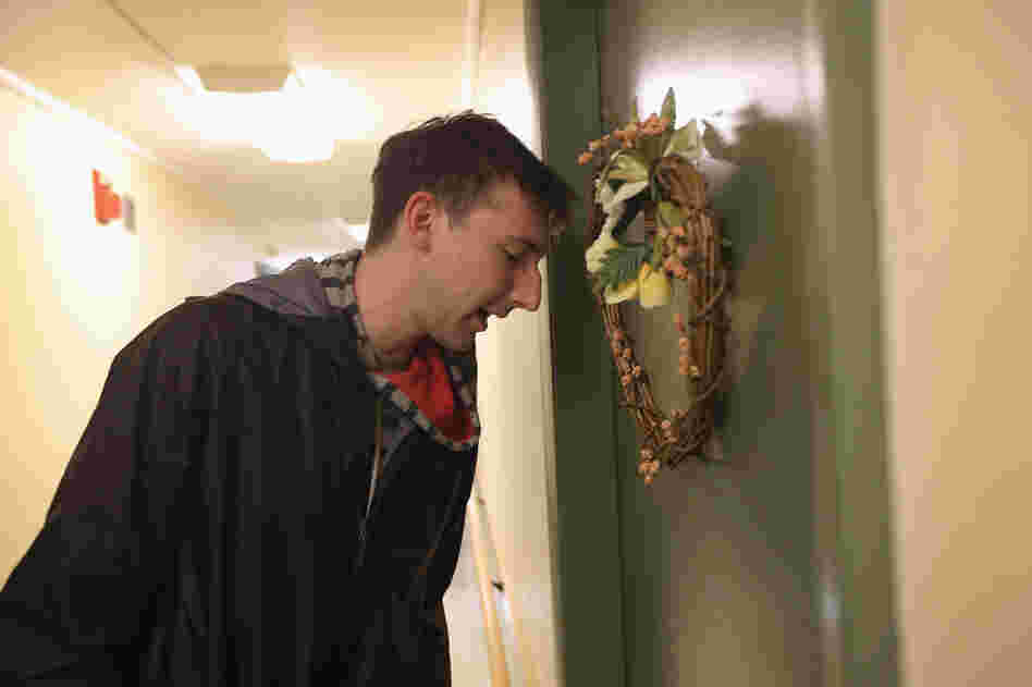 Democratic party volunteer Matt Lattanzi speaks with a potential voter while canvassing in a Youngstown, Ohio, apartment building on Oct. 28