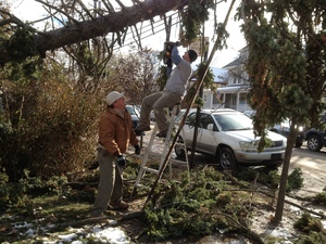 A group of Afghanistan and Iraq veterans chain-saw a huge spruce tree, hung up on the wires in front of Sami McFarlanes' house off Rockaway Beach Boulevard in Queens.