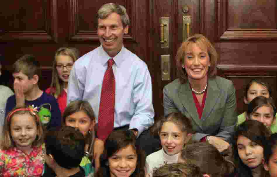New Hampshire Gov.-elect Maggie Hassan and Gov. John Lynch visit with fourth-graders from Derry, N.H., at the Statehouse on Thursday in Concord. Come January, Hassan will govern a state where â" for the first time â" all U.S. senators and representatives also are women.