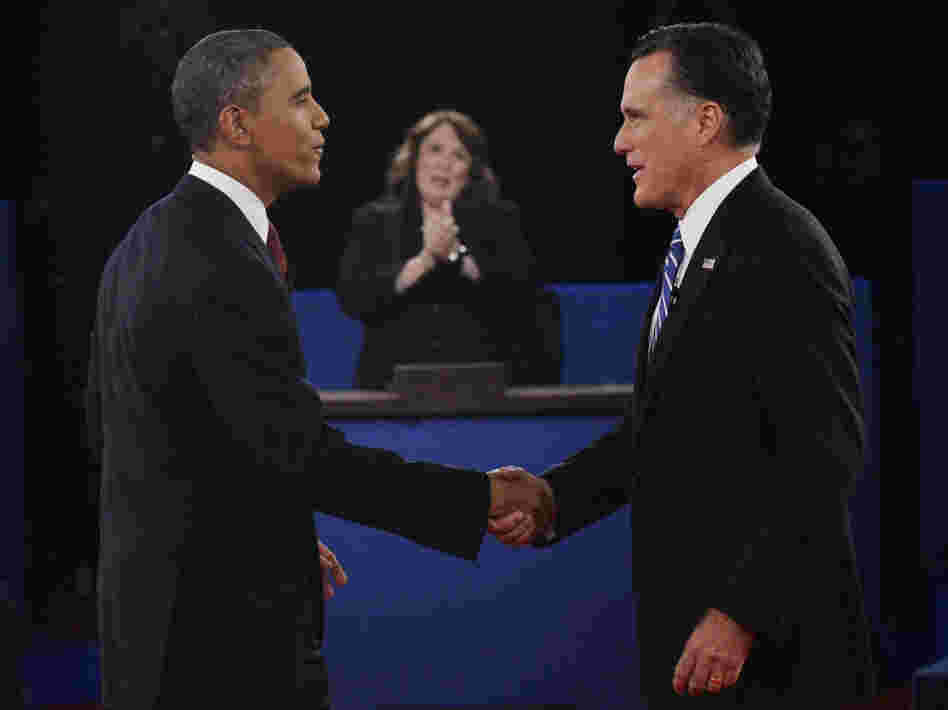 Moderator Candy Crowley applauds as President Obama shakes hands with former Massachusetts Gov. Mitt Romney during the second presidential debate on Oct. 16.