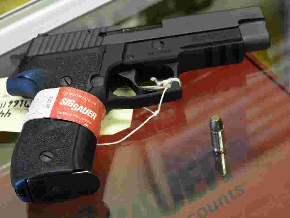 A Sig Sauer handgun on sale at a shop in Tucker, Ga.