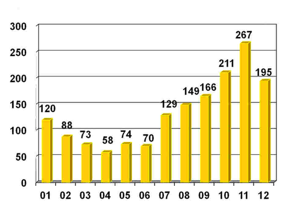The number of new drug shortages each year in the U.S., from 2001 through Dec. 21, 2012.