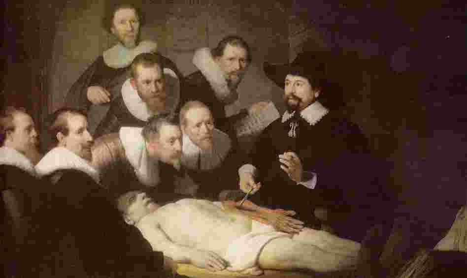 An autopsy helps medical students learn human anatomy in Rembrandt's painting The Anatomy Lesson of Dr. Nicolaes Tulp from 1632.