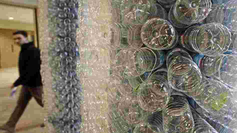 A student walks past a sculpture made of empty water bottles on the University of Vermont campus. UVM has banned the sale of bottled water.