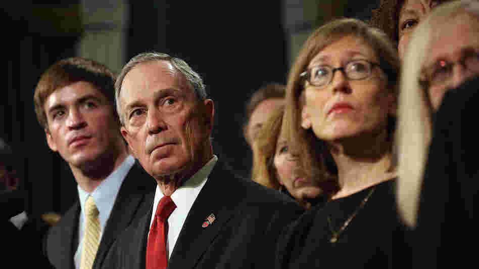 New York City Mayor Michael Bloomberg stands with people who have been affected by gun violence at a news conference at City Hall on Dec. 17, 2012.