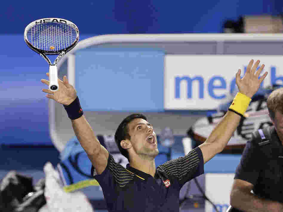 The 25-year-old Serb didn't rip his shirt off this time, as he did to celebrate his epic 5-hour, 53-minute win over Rafael Nadal in last year's final. He just did a little dance, looked up to the sky and then applauded the crowd after the 3-hour, 40-minute match.