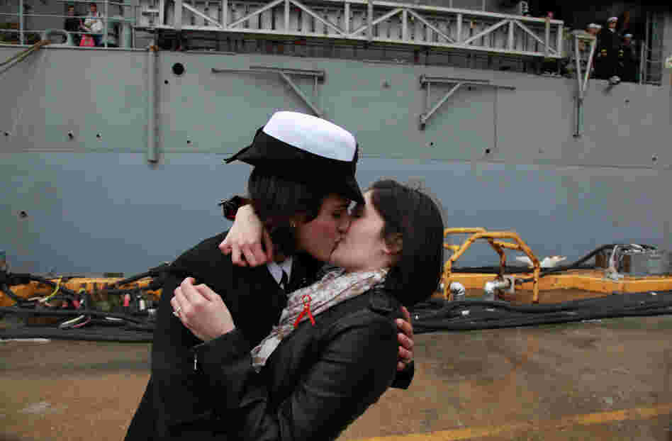 Dec. 21, 2011: Petty Officer 2nd Class Marissa Gaeta, left, kisses her girlfriend of two years, Petty Officer 3rd Class Citlalic Snell at Joint Expeditionary Base Little Creek in Virginia Beach, Va. Gaeta's ship had returned from 80 days at sea. Their "first kiss" that day was a first of its kind for the Navy.