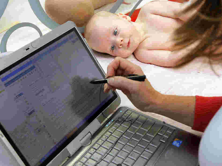 Patient William Wishart, age 4 months, looks on as Dr. Melanie Walker uses a portable computer to enter information from his exam into an electronic medical records system, in North Raleigh, N.C., in November.