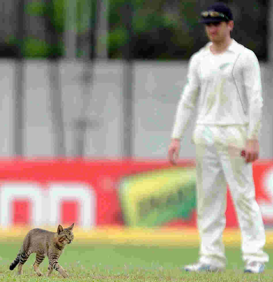 Here Kitty: New Zealand cricketer Kane Williamson looks on as a cat walks on the outfield during a test match between Sri Lanka and New Zealand.