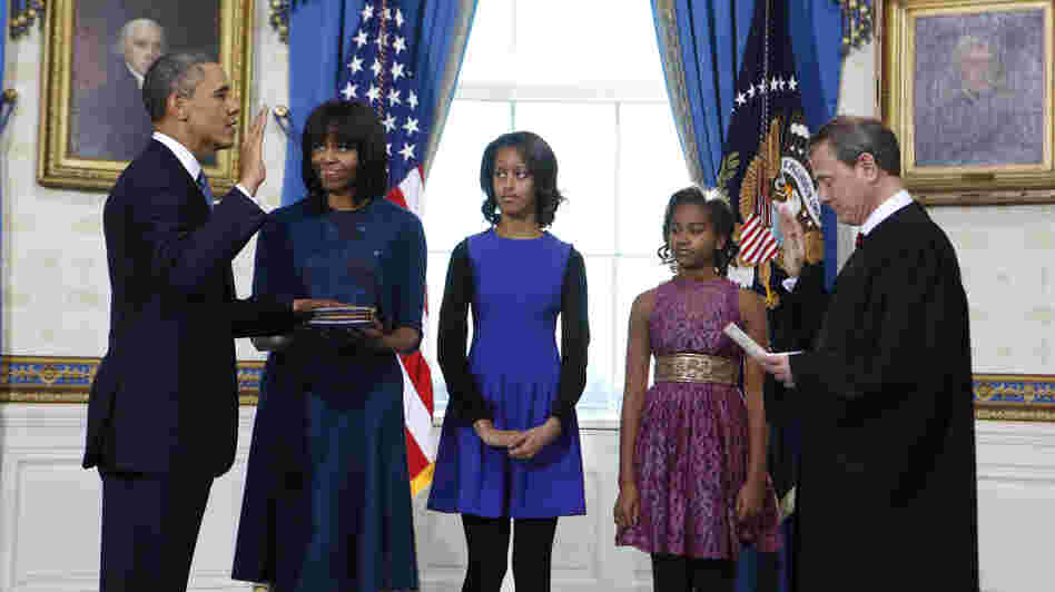 President Obama is officially sworn in Sunday by Chief Justice John Roberts in the Blue Room of the White House. Next to Obama are first lady Michelle Obama, holding the Robinson Family Bible, and their daughters, Malia and Sasha.