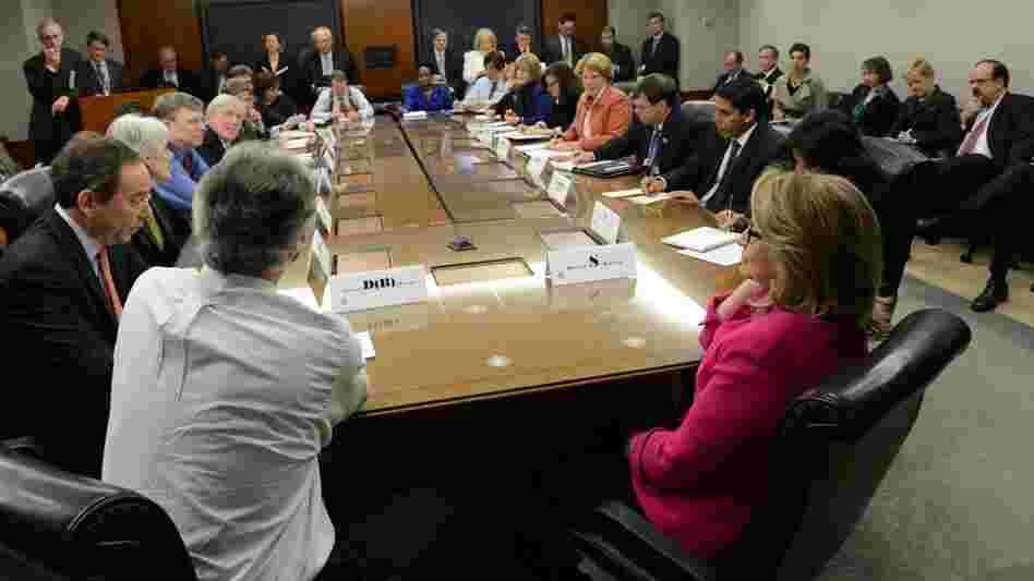Secretary of State Hillary Clinton (at right, in front) in a photo released today (Jan 7, 2013) by the State Department. A spokesman says it was taken around 9:15 a.m. ET at a meeting with the department's assistant secretaries.