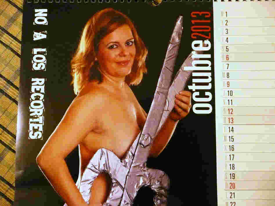 Lauren Frayer for NPREva Maria Casas Sancho â" Ms. June â" shows off the racy calendar. The calendar has raised enough money to pay for three months of school bus service.