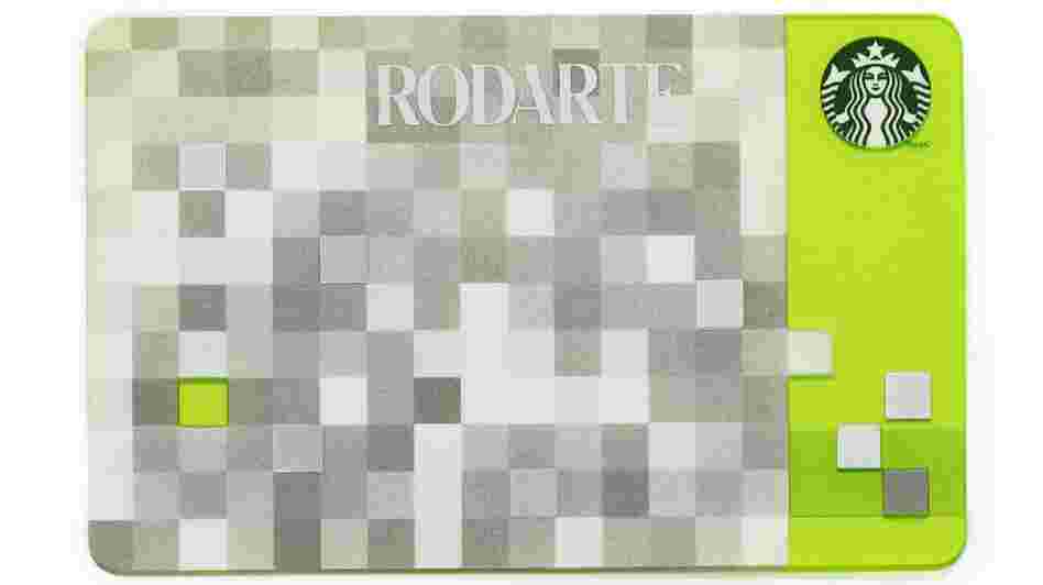 This product image released by Starbucks shows the Rodarte design Starbucks gift card, part of a series of limited-edition products for the holiday season. The card is one of several Rodarte-designed items including tote bags, cup sleeves and mug. The signature pattern features a pixelated checkerboard of gray, white and silver set against different shades of green.