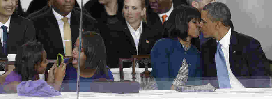 Second, we'll point to perhaps the sweetest moment of the evening. The whole Obama family was in the review stand and Sasha and Malia started taking some photographs with their phones. They wanted one of their parents kissing, except it took a few tries. Now This News has the video: