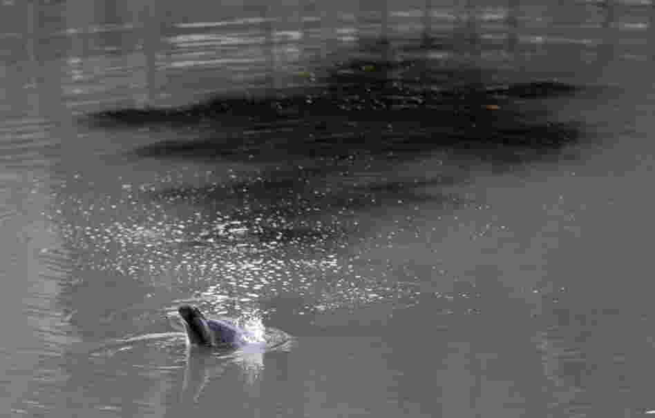 A common dolphin comes up for air in a section of the Gowanus Canal after getting stuck in Brooklyn borough of New York City.
