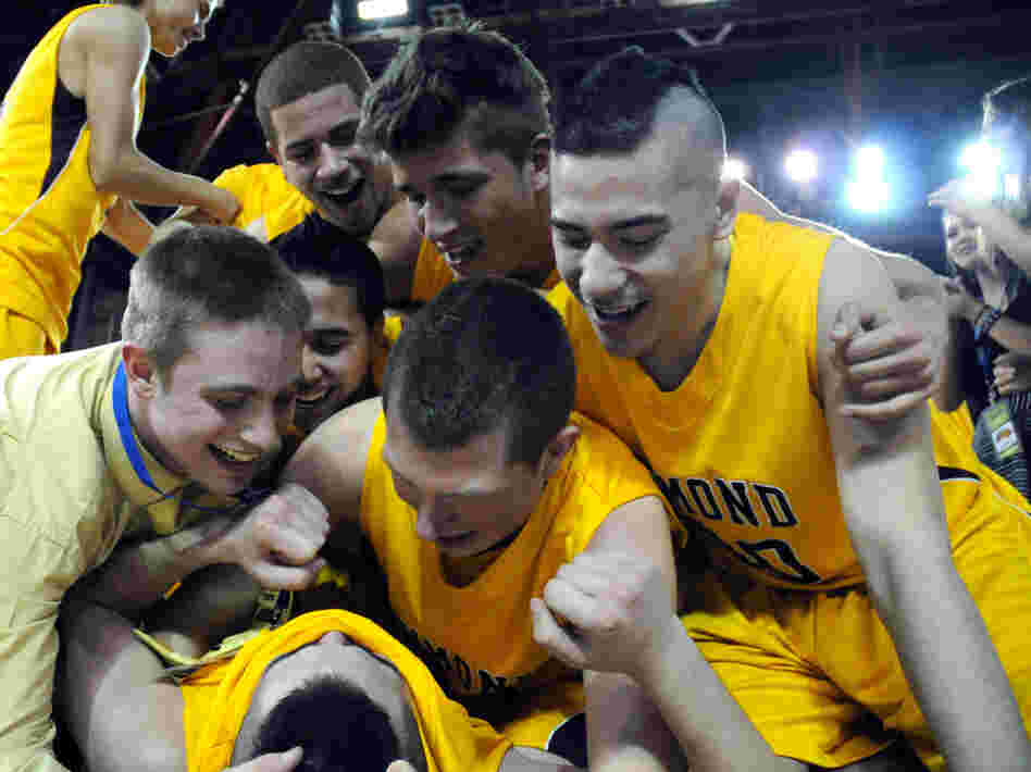 Members of the boys basketball team from Dimond High School in Anchorage, Alaska, celebrate their 2012 state championship victory. Psychological research shows that sports camaraderie improves teenagers' mental health.
