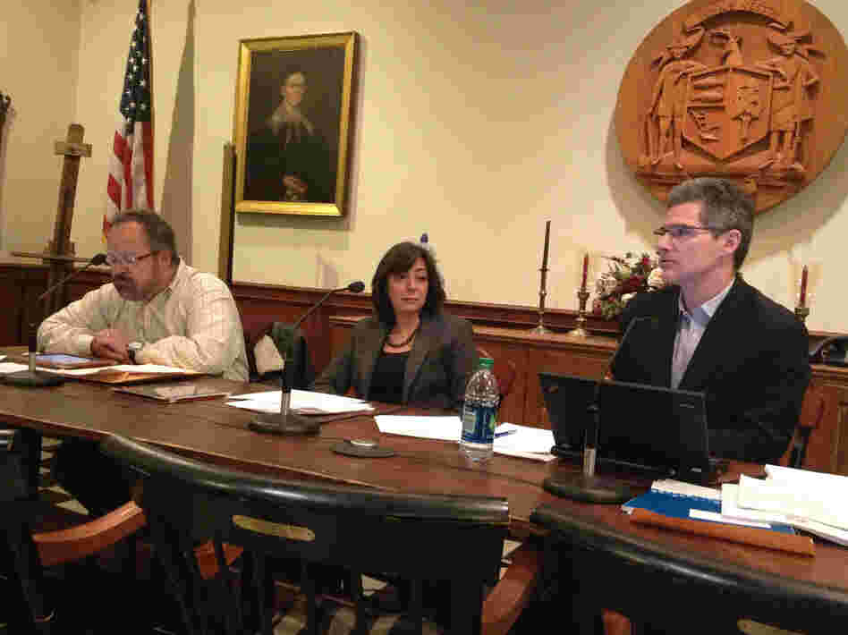 The three selectmen for the town of Weston, Conn., (from left: David Muller, Gayle Weinstein and Dennis Tracey) hold a town meeting in which they discuss a proposed gun control ordinance.